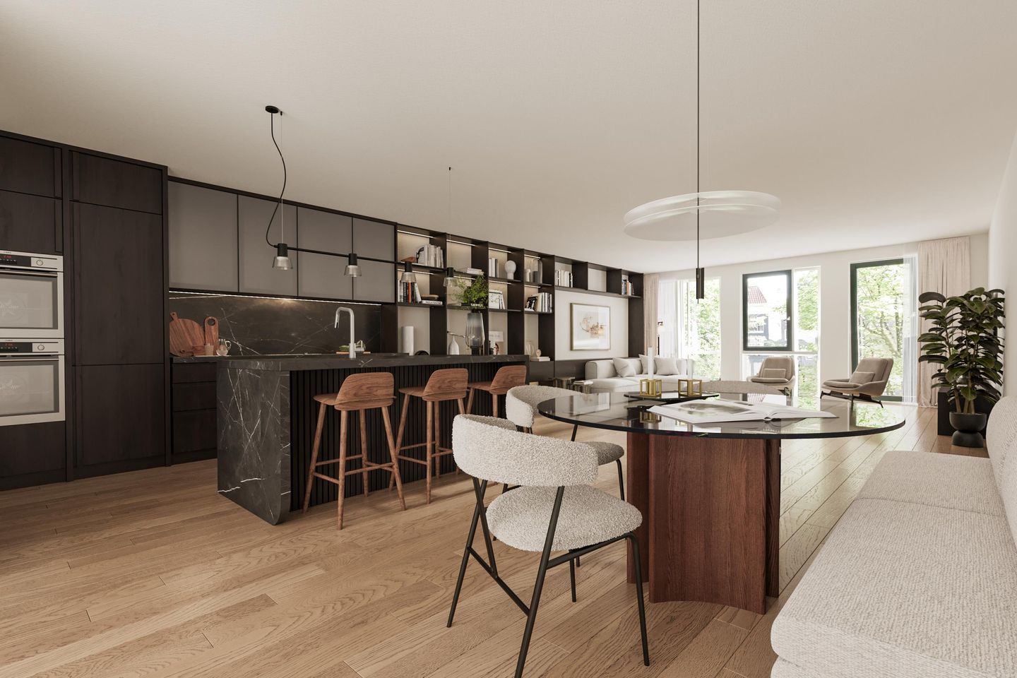 The generous living room with large windows offers a stunning view over the canal. The open layout creates a seamless connection between the living and dining areas. The open kitchen is located at the rear of the living room and is equipped with all necessary built-in appliances.