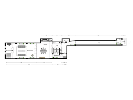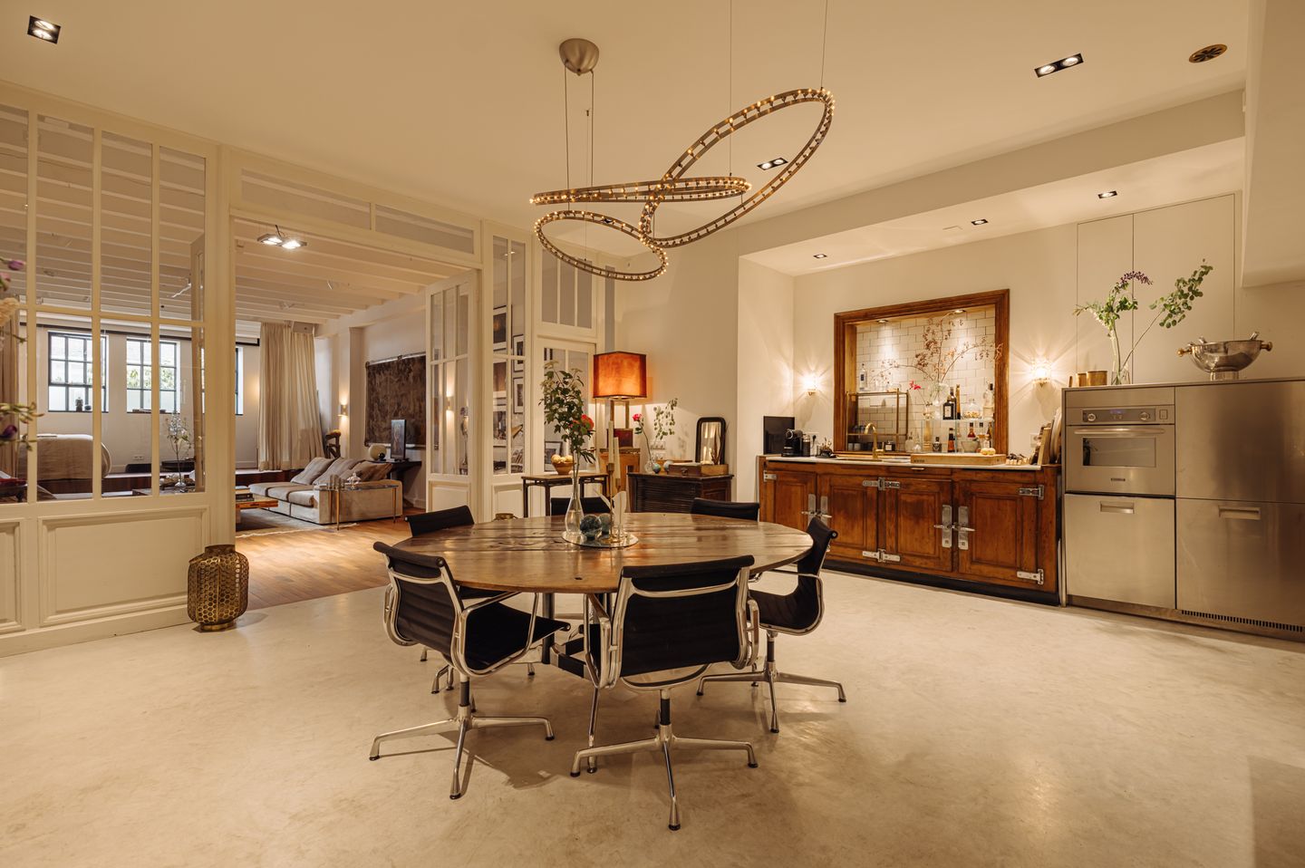 is gecreëerd. De ruimte is voorzien van een klassieke dubbele openslaande deuren met glas. Deze creëert een elegante scheiding tussen de voorzijde met multifunctionele open pantry en de achterzijde met voldoende plek voor werkruimte, overlegruimte en/of ontspanningsruimte. Door de huidige, doordachte, indeling van deze ruimte leent het zich eveneens uitstekend als woning of pied-à-terre. Met leven/koken in het voorste deel, subtiel gescheiden van het woongedeelte middels de klassieke dubbele openslaande deuren met glas, en een slaapgedeelte elegant gemarkeerd door een podium met gordijn. Zowel praktisch én esthetisch verantwoord.