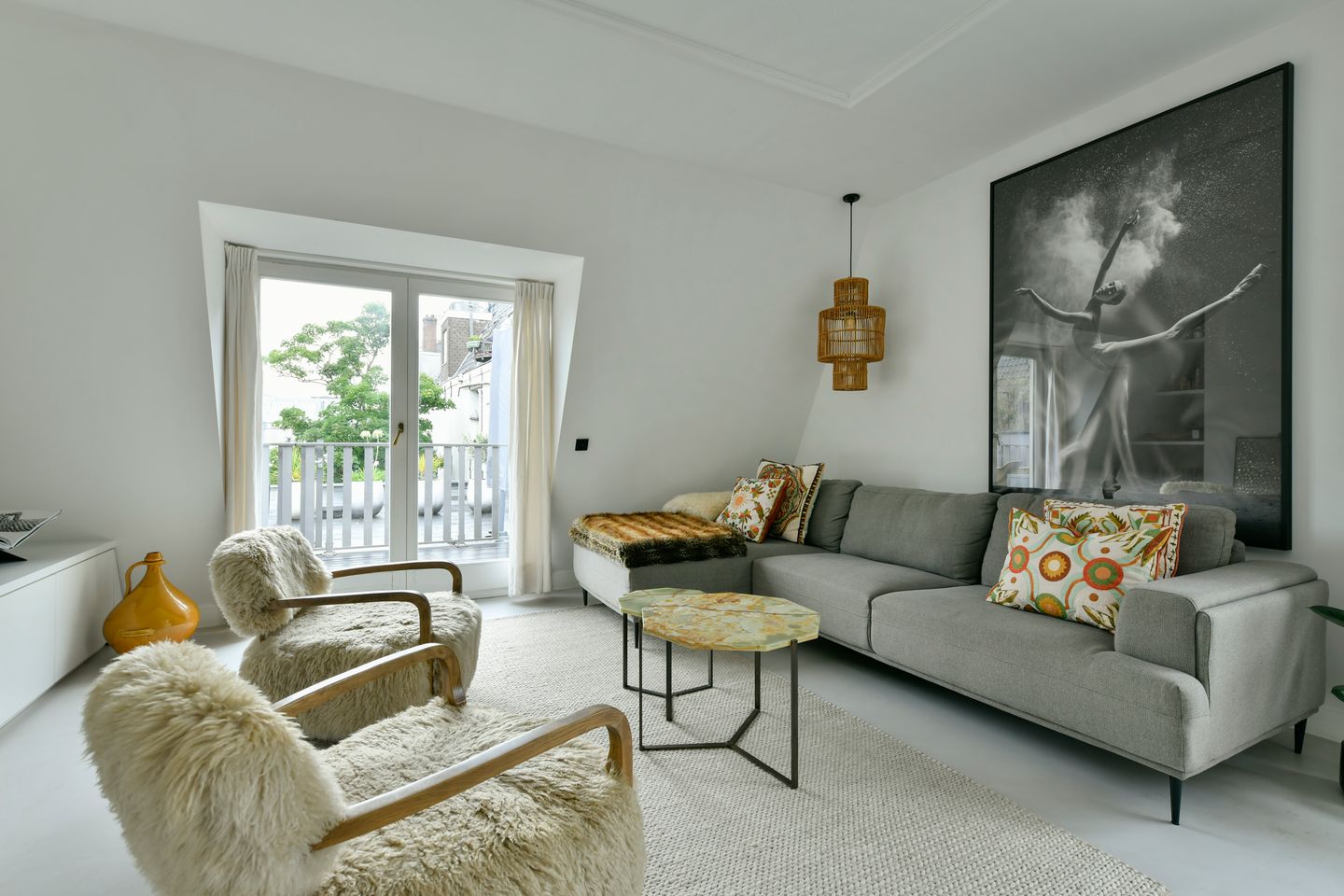 De ontvangst is indrukwekkend: hoge plafonds en grote raampartijen aan twee zijden zorgen voor een ruimtelijk gevoel en een prachtige lichtval.