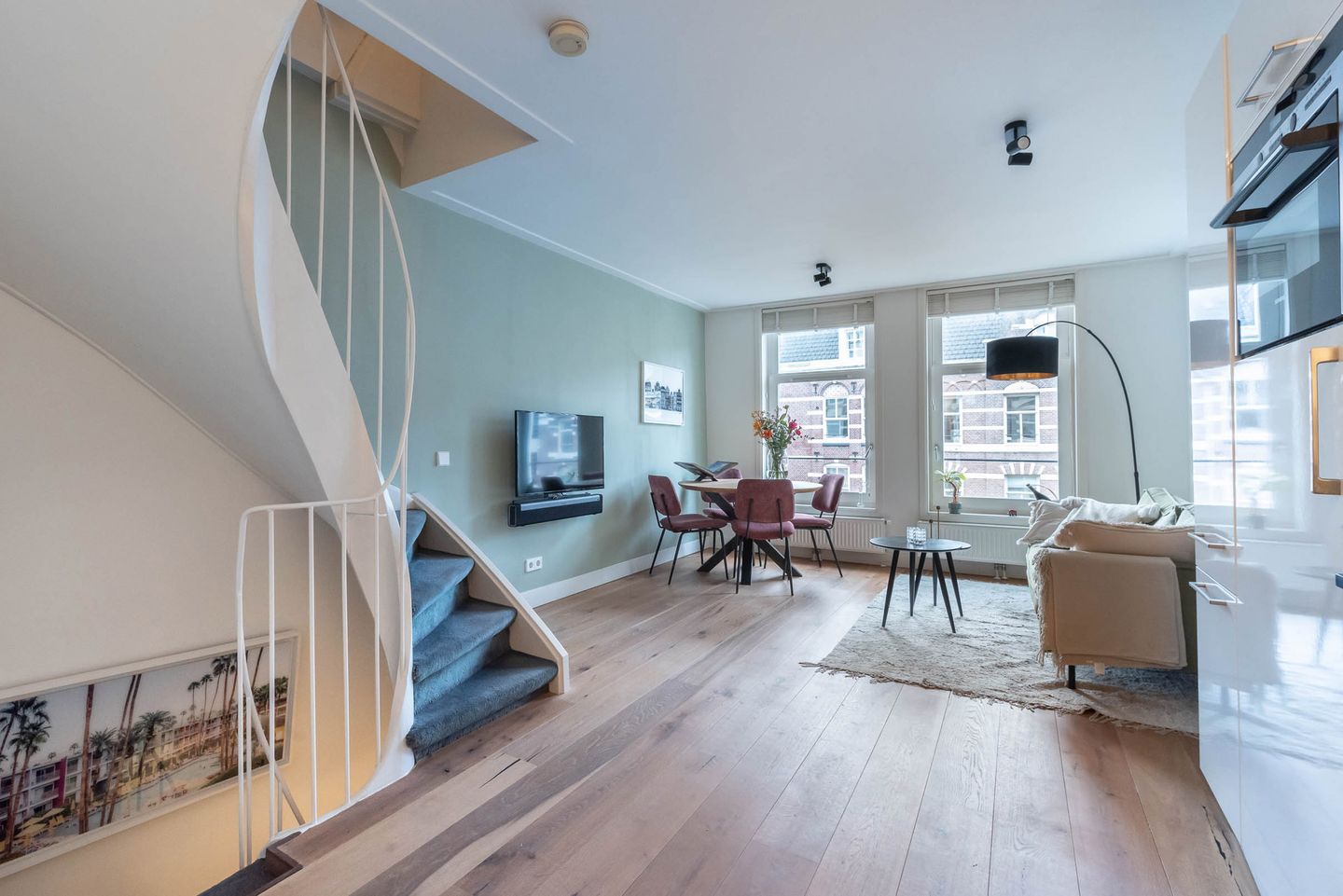 3e etage: Een trap met karakteristieke leuningen brengt je naar de open keuken en woonkamer. De twee grote raamkozijnen met bovenlichten aan de voorzijde maken de ruimte enorm licht. De raamkozijnen geven eveneens een kenmerkend uitzicht over de bruisende Kinkerstraat en de Da Costakade. De nette, moderne keuken is verbonden aan de woonkamer en is voorzien van verschillende inbouwapparatuur met onder andere een 4 pits-fornuis, combi-oven, afzuigsysteem, koel-vriescombinatie en veel werkruimte.