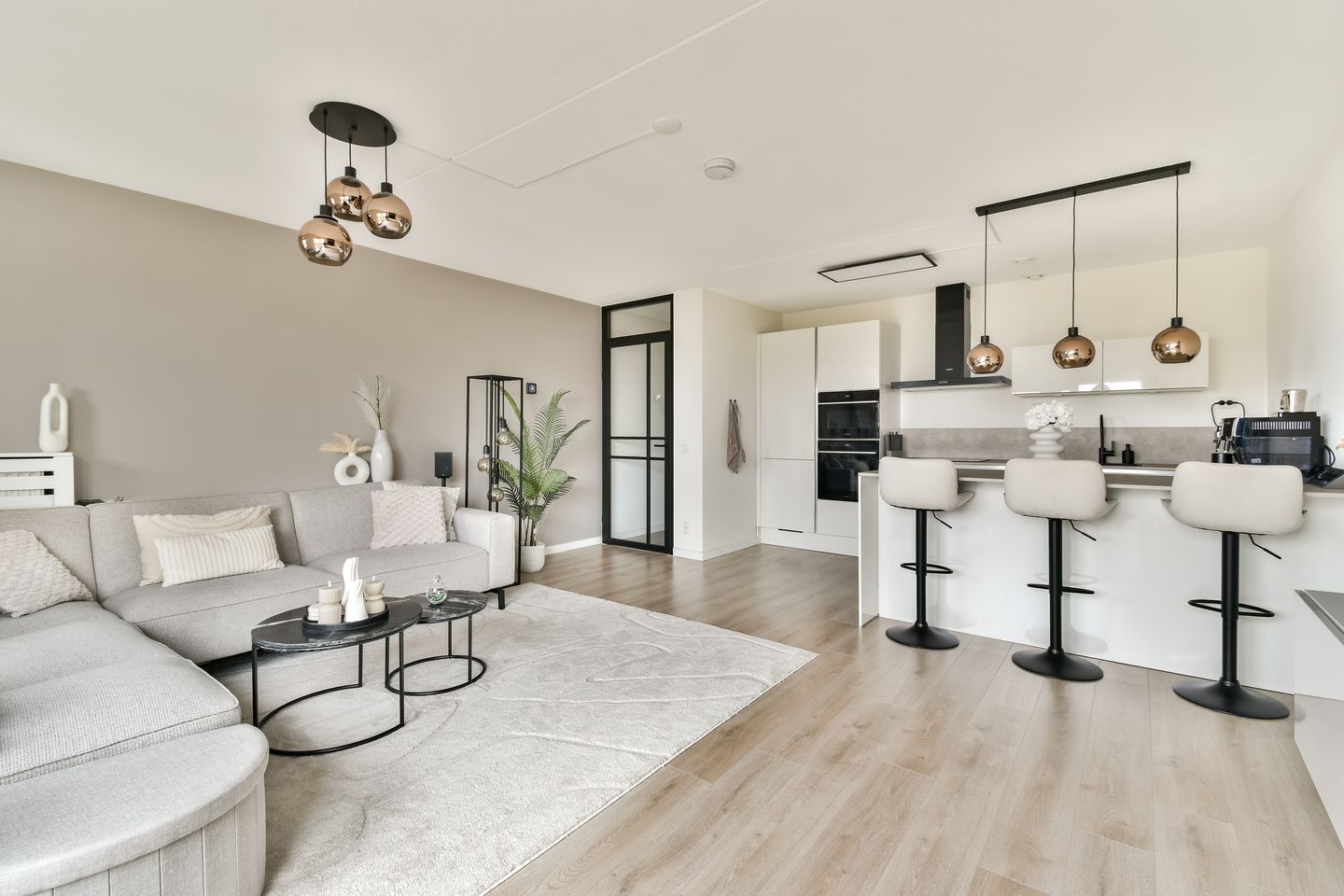 The open-plan kitchen connects beautifully to the living room and has a high-quality finish. It is equipped with built-in appliances, including an induction hob, oven and dishwasher. A great spot for everyday cooking, as well as long, relaxed dinners with friends or family.