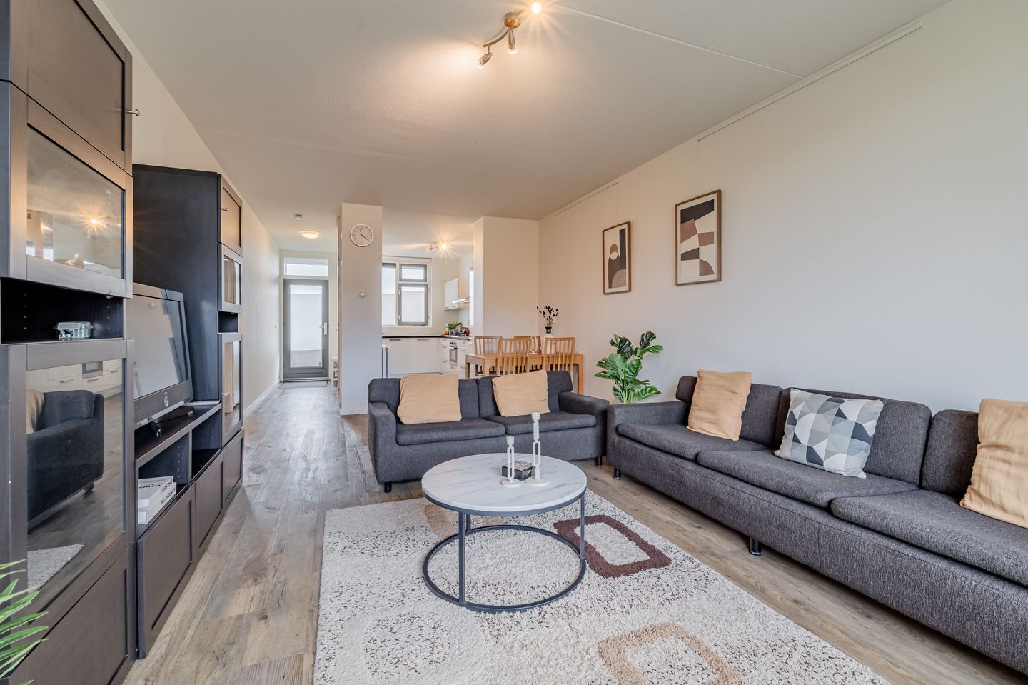 De woning is vernieuwbouw uit 2016 en dat zie je terug in de nette afwerking, met glad stucwerk op zowel de wanden als plafonds. De laminaatvloer en raamdecoratie maken het geheel compleet, waardoor je eigenlijk alleen nog maar je spullen hoeft neer te zetten.