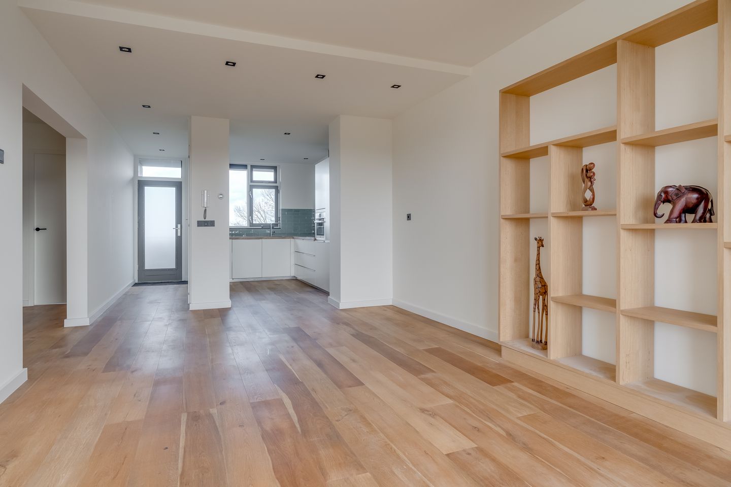 Aan de voorzijde bevindt zich de volledig vernieuwde keuken in een chique crèmekleur met een stijlvol houten werkblad. Deze trendy keuken is uitgerust met alle moderne inbouwapparatuur, waaronder een vaatwasser, combi-oven, inductiekookplaat, afzuigkap en een koel-vriescombinatie. Uniek aan dit appartement is de schuifpui in de woonkamer, waarmee je eenvoudig toegang hebt tot het brede balkon op het zuidwesten. Hier kun je volop genieten van het zonnetje en het schitterende uitzicht.