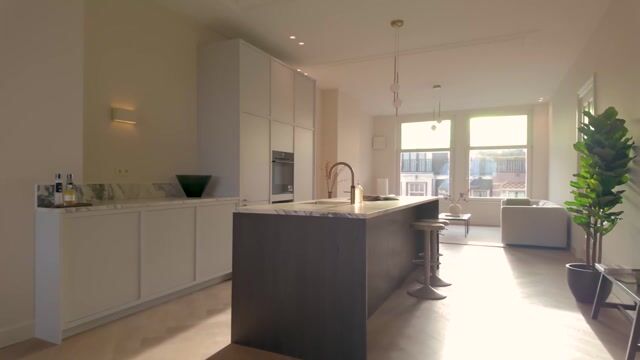 Dit luxe appartement is gelegen op de derde verdieping en wordt gekenmerkt door een ruime en open indeling, met grote raampartijen aan zowel de voor- als achterzijde die zorgen voor een prettige lichtinval. De woning is hoogwaardig afgewerkt en biedt een comfortabele woonomgeving met een rustige, verfijnde uitstraling. De woonkamer is gesitueerd aan de voorzijde van het appartement en beschikt over een plafondhoogte van circa 3,07 meter. De woonruimte vormt samen met de keuken en eetkamer één grote, open leefruimte. De luxe keuken is centraal in de woning gelegen en uitgevoerd met een royaal spoel- en kookeiland, voorzien van een inductiekookplaat, spoelbak en Quooker. Daarnaast beschikt de keuken over een koelkast, vriezer, combi-oven, klimaatkast en voldoende kastruimte. Het kookeiland fungeert tevens als comfortabele bar. Aan de achterzijde van het appartement bevindt zich het overdekte balkon, dat een fraai uitzicht biedt over de groene tuinen aan de achterzijde en een rustige plek vormt om buiten te zitten. Aan de voorzijde van de woning bevindt zich de gang, vanwaar toegang is tot de eerste slaapkamer, het separate toilet, de wasruimte/berging en de eerste badkamer. Deze badkamer is uitgerust met een inloopdouche en een dubbele wastafel met meubel. De tweede slaapkamer is gelegen aan de achterzijde van het appartement en beschikt over vaste kastruimte en een ensuite badkamer, voorzien van een inloopdouche en een wastafel met meubel.