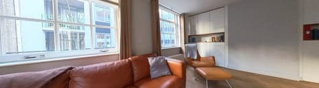 De centrale entree wordt gedeeld met het bovenliggende appartement. Via de trap kom je bij de voordeur, die toegang geeft tot de comfortabele woonkamer. Deze ligt op de hoek van de Krom Boomssloot en de Dijkstraat en heeft dankzij de vele ramen een fijne natuurlijke lichtinval. In de woonkamer is een grote ingebouwde kastenwand aanwezig voor extra opbergruimte.