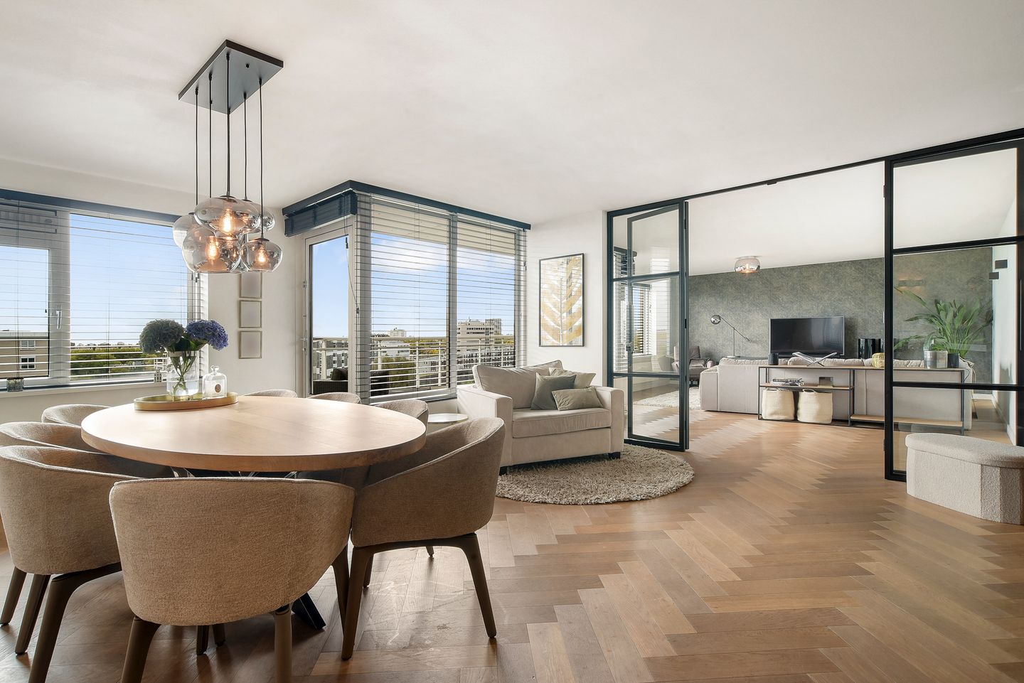 Bij binnenkomst krijgt u door de riante hal direct een ruimtelijke beleving en een doorkijk naar de woonkamer aan de andere kant van het appartement. Dankzij de hoge ligging biedt de woonkamer een waanzinnig uitzicht. De gevel bestaat voor een groot deel uit glas waardoor er veel natuurlijk licht de woning binnen valt. De woning brede woon- en eetkamer is ruim 11,5 meter breed en biedt een panoramisch uitzicht over Buitenveldert en de Zuid-As. De ruimtes worden gescheiden middels moderne stalen glazendeuren. Vanuit beide ruimtes is er toegang tot het zonnige, op het zuiden gelegen balkon.