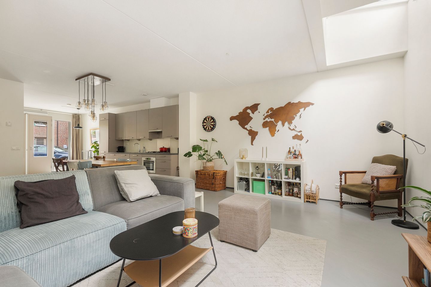 Entree; hal; separaat toilet met fontein; luxe open woonkeuken voorzien van diverse inbouwapparatuur; riante lichte woonkamer voorzien van twee lichtkoepels.