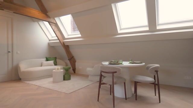 Bij binnenkomst valt direct de lichte en open leefruimte op. Dankzij het zadeldak geniet de woning van hoge plafonds, wat zorgt voor een bijzonder ruimtelijk gevoel. De combinatie van meerdere dakramen en zichtbare balken geeft het appartement een warme, sfeervolle uitstraling met veel natuurlijk licht. De open keuken is nieuw, ruim opgezet en strak vormgegeven, en voorzien van een composiet werkblad en hoogwaardige Siemens-inbouwapparatuur, waaronder een Quooker, vaatwasser, koelkast met vriezer, combi-oven en een inductiekookplaat met geïntegreerde afzuiging.