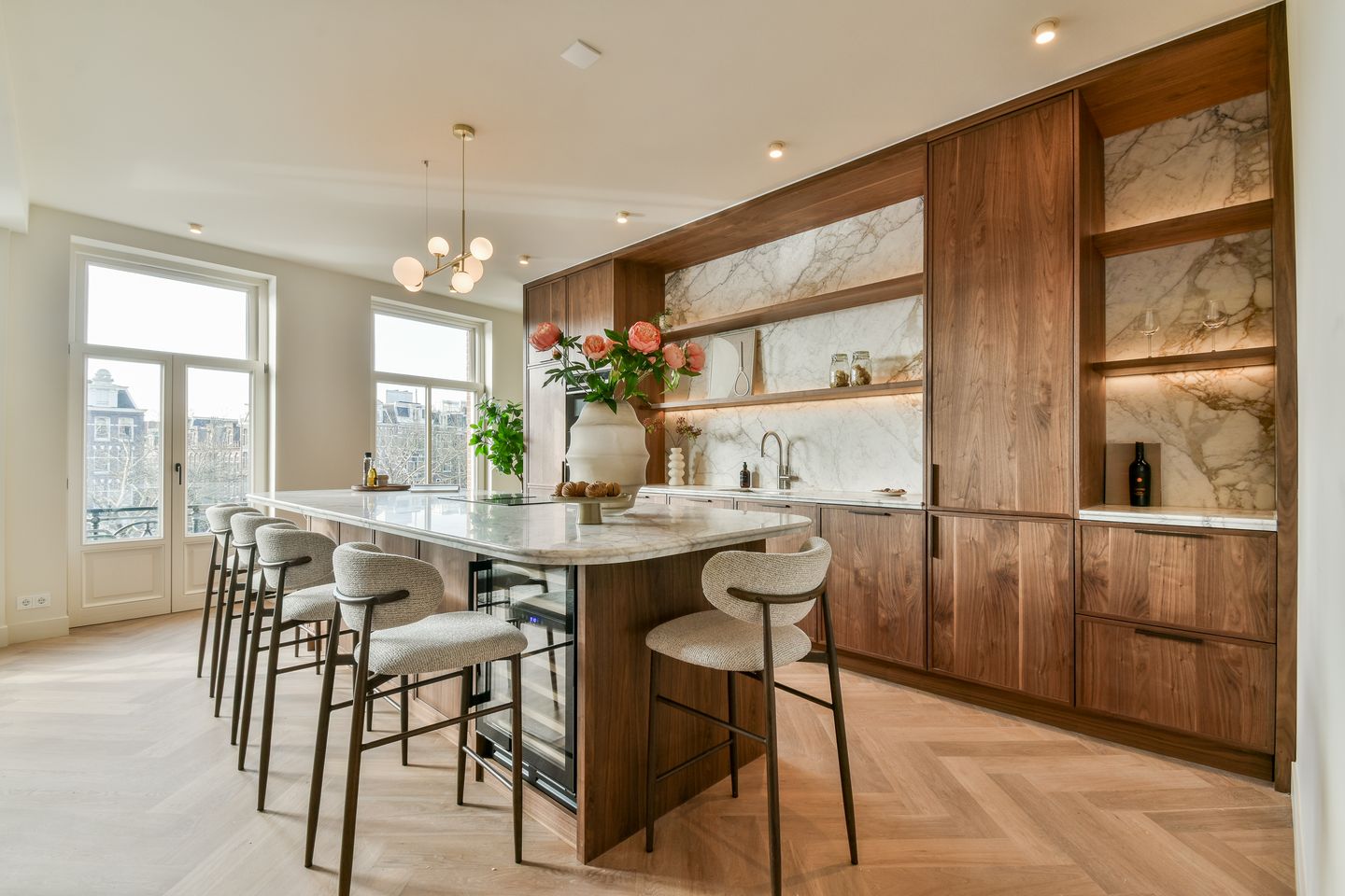 Entrance. Spacious hallway providing access to all rooms. Generous and bright living and dining area with a stylish open kitchen at the front, featuring a cooking island and high-end built-in appliances. Through French doors, you access the sunny balcony. From both the living room and the balcony, there are stunning, wide views over the Singelgracht.