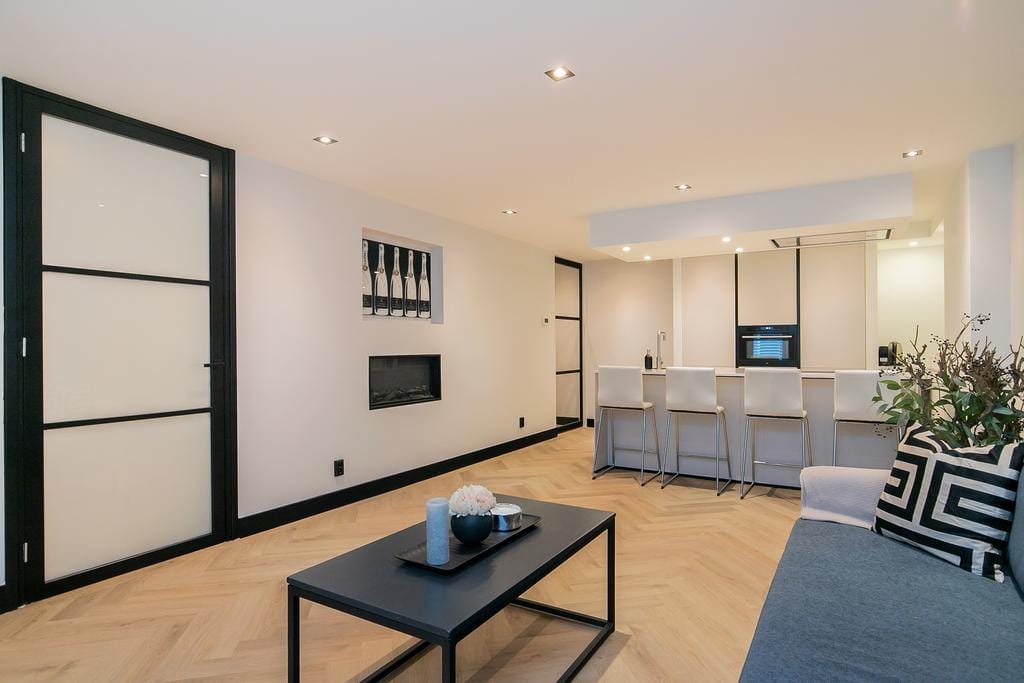 The first floor is easily accessible via the communal staircase or the elevator. Through the entrance of the apartment you will find the hall with access to almost all rooms. On the left is the modern kitchen diner (with pivot door in the hall, equipped with various built-in appliances including dishwasher and combi-microwave). The stylish living room with open kitchen contains a cozy electric fireplace. Beautiful light shutters hang in front of the windows. From the living room there is a wide French door to the spacious bedroom with lots of natural light and a generous closet space. Due to the size of the bedroom and the fact that there is access from two doors, two bedrooms can easily be created. The bedroom gives access to the laundry room. On the other side of the bedroom is another door to the hall. The hall also gives access to the bathroom with spacious walk-in shower and washbasin in marble style. In addition, there is a separate toilet in the same style. The entire apartment has a PVC herringbone floor with black details such as skirting boards and sockets. The entire apartment is also equipped with recessed spotlights. A storage room is also located on the first floor.