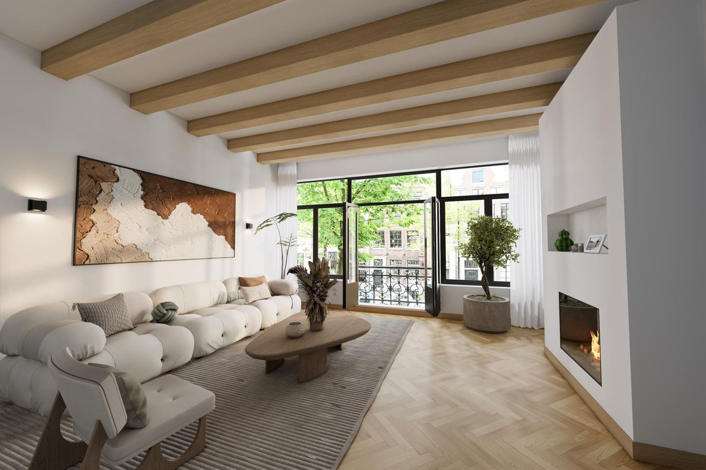Deze heeft een stijlvolle woonkamer met hoog plafond aan de grachtzijde voorzien van een openhaard en een frans balkon. Aan de achterzijde de ruime woonkeuken met aangrenzend dakterras.