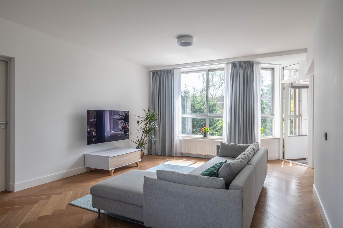The spacious living room with adjacent open kitchen is the heart of the house. Thanks to the large windows and the playful layout, this space is wonderfully light and inviting. From the living room you can access the spacious balcony facing southwest, where you can enjoy the afternoon and evening sun. You can also access this balcony from the modern fitted kitchen, which is equipped with all conveniences such as a combination oven, dishwasher, gas hob and hood.