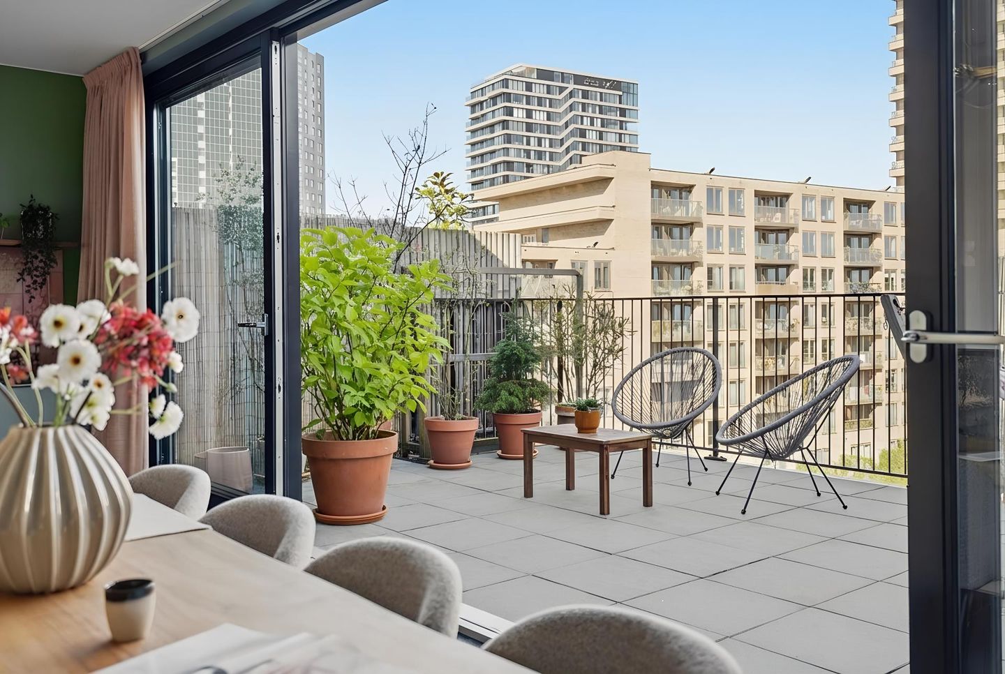 Riant dakterras met grote schuifpui.