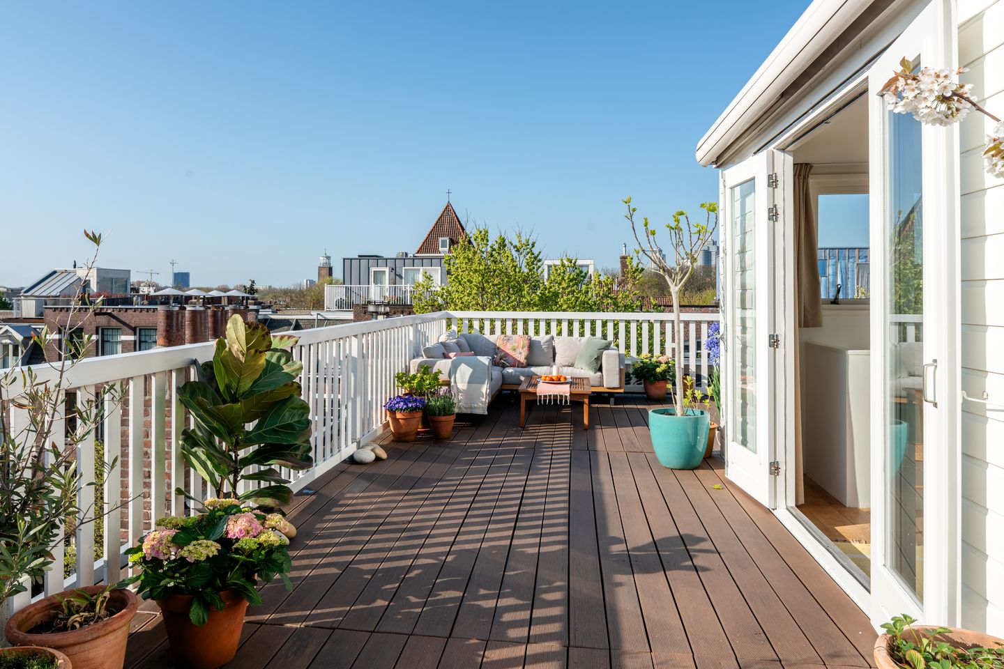 Het dakterras is een van de absolute pluspunten van de woning. Met een oppervlakte van circa 50 m2 en een vrij uitzicht over de gehele stad biedt het een unieke buitenruimte. Dankzij de vrije hoek ligging is er gedurende de hele dag zon.
