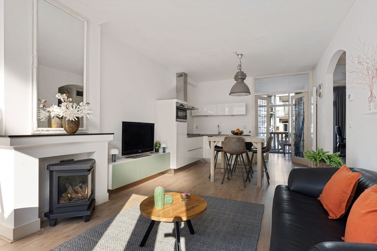 Aan de linkerzijde van de woning ligt de ruime en lichte woonkamer met open keuken. Door de doorzon indeling met ramen aan zowel de voor- als achterzijde voelt de ruimte extra ruim en licht aan. Aan de straatzijde bevindt zich een Frans balkon waar je heerlijk even buiten kunt zitten en de levendigheid van de straat kunt ervaren.