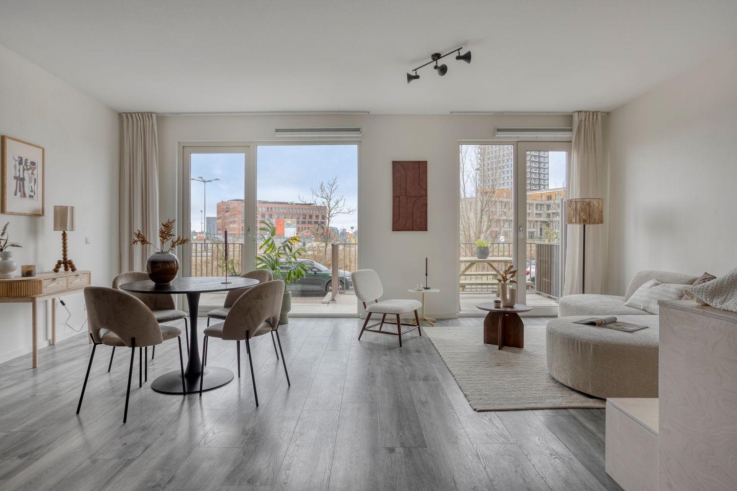 De woonkamer is alles bij elkaar bijna 30m2 en dat is bijzonder ruim te noemen. Met de prachtige grote ramen en deuren van vloer tot plafond, heeft u meer dan voldoende natuurlijke lichtinval. Er zijn hier een aantal verschillende indelingen denkbaar en een lange tafel behoord zeker tot uw opties.