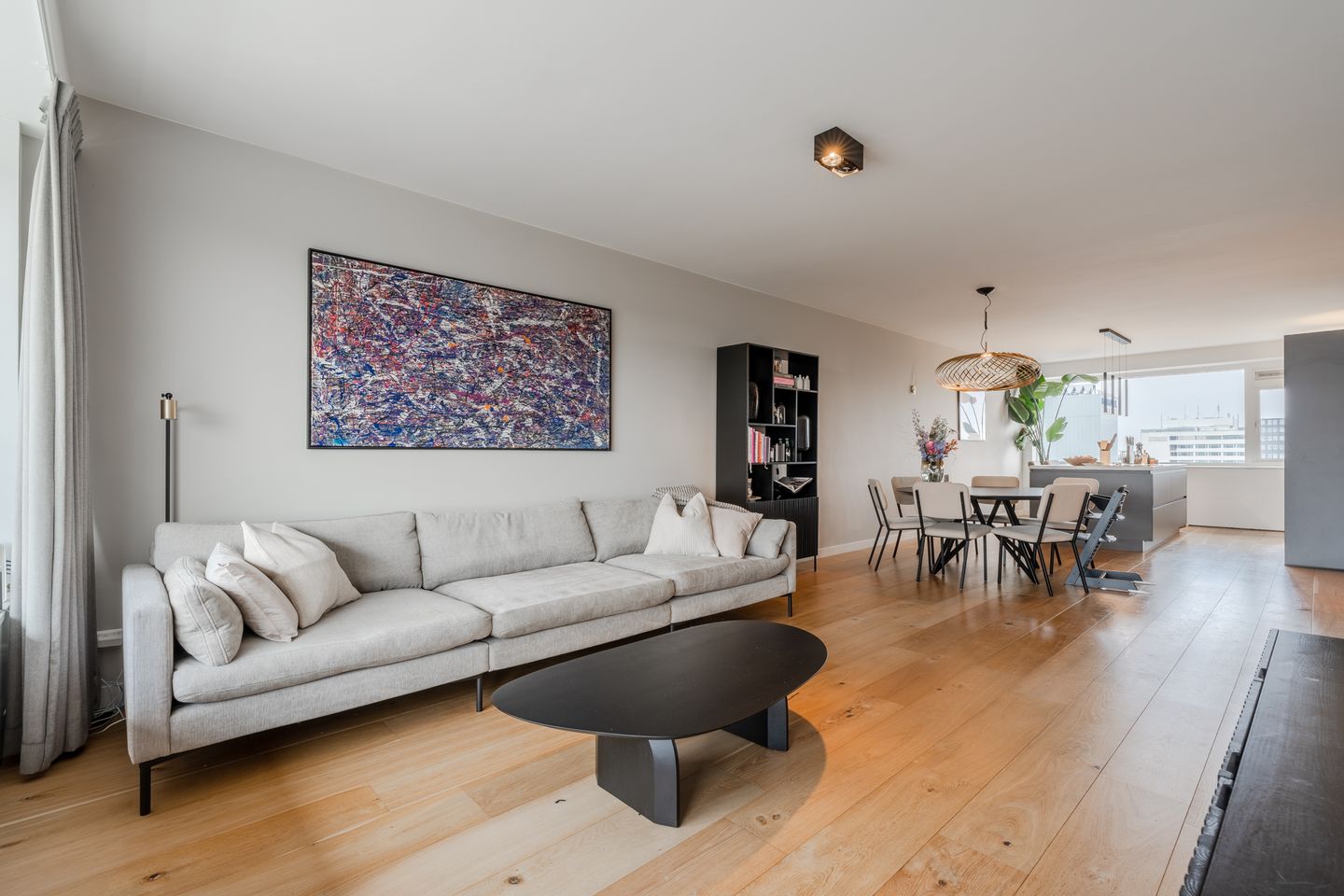 Tot slot loopt u via de hal door naar de prachtige open woonkamer met luxe woonkeuken. Wat een heerlijke plek om te genieten met uw gezelschap en natuurlijk van het fenomenale uitzicht aan beide kanten! De woonkamer is voorzien van dezelfde houten vloer, strakke wand- en plafondafwerking alsmede een openslaande deur naar het heerlijke balkon. Doordat het balkon over de volledige breedte van het appartement is gelegen, kunt u hier heerlijk genieten en tot rust komen! Aan de andere zijde van de woonkamer is de luxe open woonkeuken met kookeiland gesitueerd. De keuken is in een mooie kleurstelling uitgevoerd en van alle gemakken voorzien. Wat dacht u van een grote koelkast inclusief fresh lades, een oven, een vaatwasser, spoelbak met Quooker en diverse boven- en onderkasten voor de nodige opbergruimte. Het kookeiland is voorzien van dezelfde marmerlook aanrechtblad en heeft de beschikking over 4-pits inductiekookplaat met geïntegreerde afzuiging alsmede diverse opbergkasten en laden voor uw spullen. Het gecreëerde barretje om gezellig een drankje te drinken mag hier niet ontbreken. Een prachtige keuken waar u heerlijke gerechten kunt creëren! Het prachtige uitzicht tijdens het koken is een gratis extraatje!