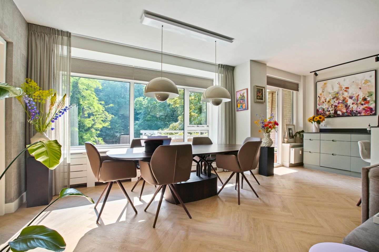 The living room connects seamlessly with the luxurious kitchen, fitted with a large island, elegant worktop, and Bosch built-in appliances, including an induction cooktop with integrated extractor, combi oven, steam oven, dishwasher, Quooker tap, and fridge-freezer. The kitchen provides access to the balcony, a perfect spot to relax while overlooking Rembrandtpark.