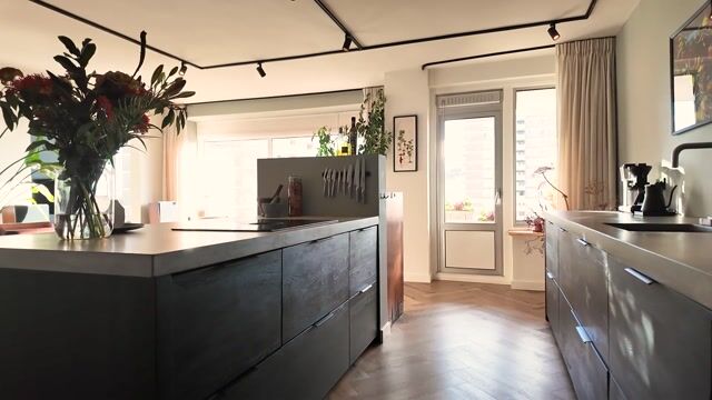 Industriële accenten, warme houttinten en rijke materialen geven de ruimte karakter zonder dat het druk aanvoelt. Alles klopt, alles ademt rust. De woning heeft op maat gemaakte stalen deuren en kasten met hout van oude spoorwegbielzen – een karaktervolle vintage touch die elegantie toevoegt.