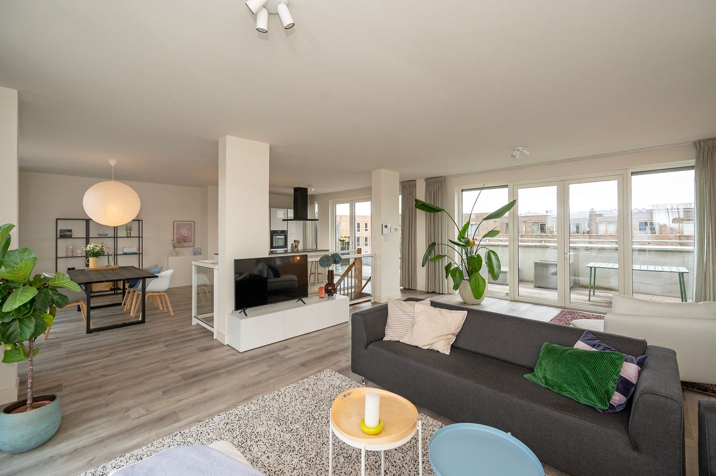 Vanuit de woonkamer geven twee sets openslaande deuren toegang tot het ruime dakterras van 28 m² met uitzicht op de gracht – perfect om te genieten van zon en privacy.