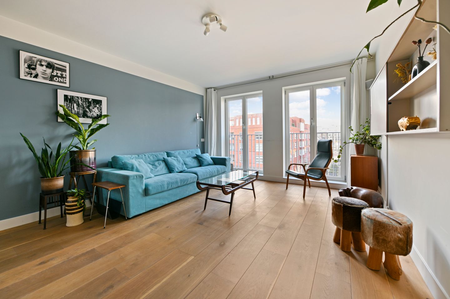 Via de houten trap daal je af naar de derde etage. Hier bevindt zich de royale woonkamer, gelegen aan de achterzijde van het appartement. Dankzij de grote raampartijen van de openslaande deuren valt het licht overvloedig naar binnen, wat zorgt voor een ‘binnen is buiten’ en ruimtelijk gevoel. De strakke afwerking en de moderne uitstraling maken dit tot een heerlijke plek om te ontspannen of gasten te ontvangen.