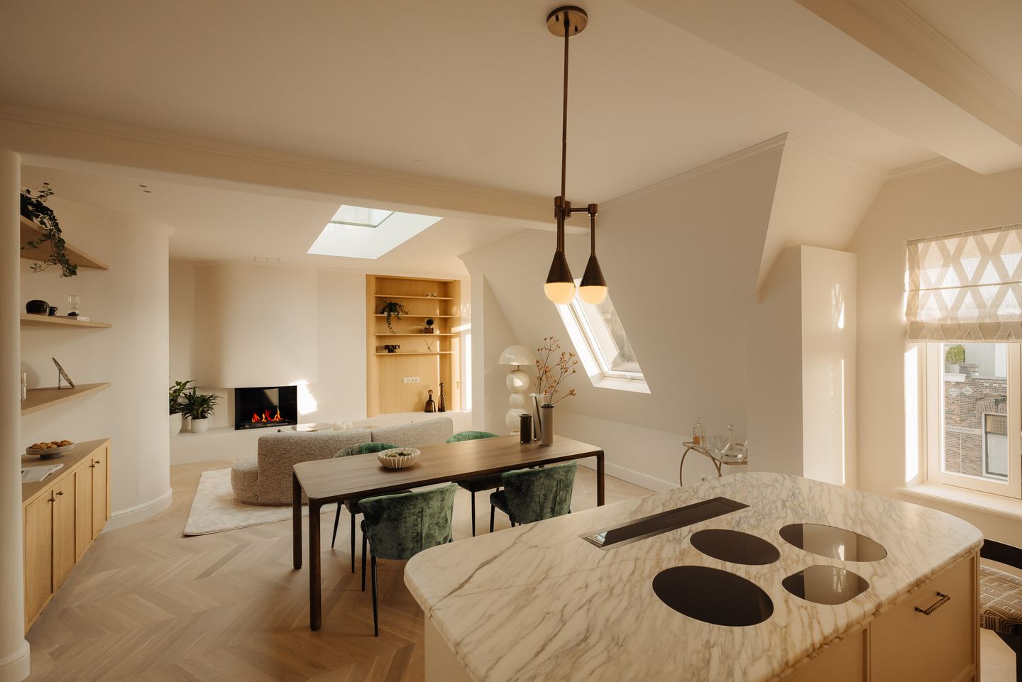 This stunning top-floor residence stands out thanks to its sophisticated finishes, featuring meticulously selected, high-quality materials throughout. The design and styling are perfectly harmonized, forming a flawless and cohesive whole. The result is phenomenal: the organic shapes, bespoke cabinetry, carefully sourced marble, and even the porcelain power outlets have all been thoughtfully crafted—each a true visual delight.