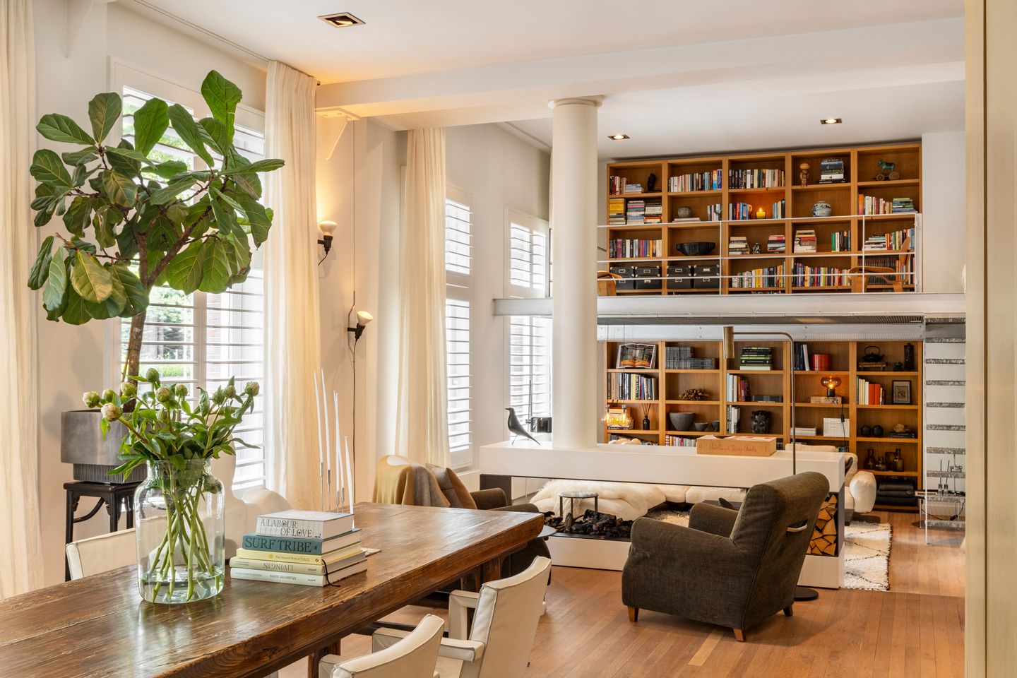 • Indrukwekkende woonkamer met op maat ontworpen designgashaard van Boley en mezzanine (ingericht als tweede werkruimte);