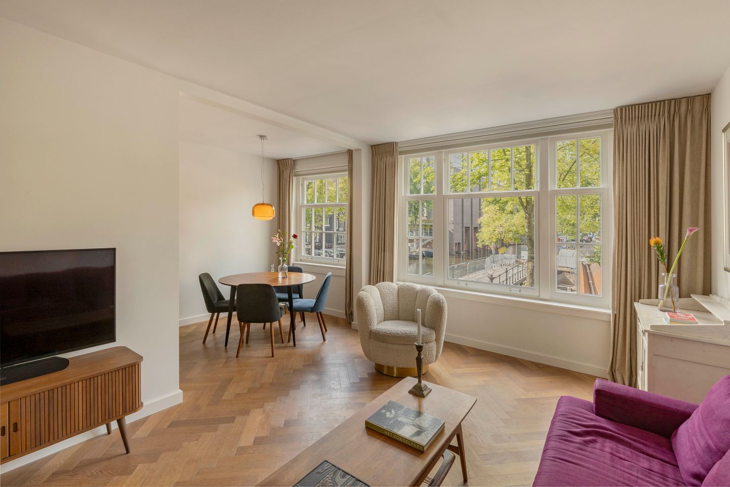 The apartment is located on the first floor and has a pleasant, functional layout. At the front is the bright living room with high windows and a panoramic view of the canal and the iconic Royal Theater Carré. The luxurious open kitchen is arranged in an L-shape and equipped with modern built-in appliances, with ample work and storage space.