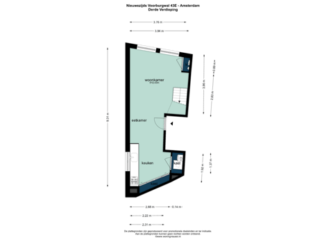 Op de derde verdieping bevindt zich de lichte woonkamer met open keuken. De ruimte beschikt over twee grote ramen aan de voorzijde met isolatieglas en nieuwe kozijnen. De open keuken ligt aan de achterzijde en is voorzien van diverse inbouwapparatuur, waaronder een koelkast, vaatwasser, gaskookplaat en afzuigkap. Naast de keuken bevindt zich een diepe kast met opstelplaats voor de CV-ketel en aansluiting voor de wasmachine. Langs de achterwand is een praktische kastenwand met schuifpanelen gerealiseerd. De vloer is afgewerkt met Frans eikenhout, wat de ruimte een warme en sfeervolle uitstraling geeft. De trap aan de voorzijde leidt naar de slaapverdieping.