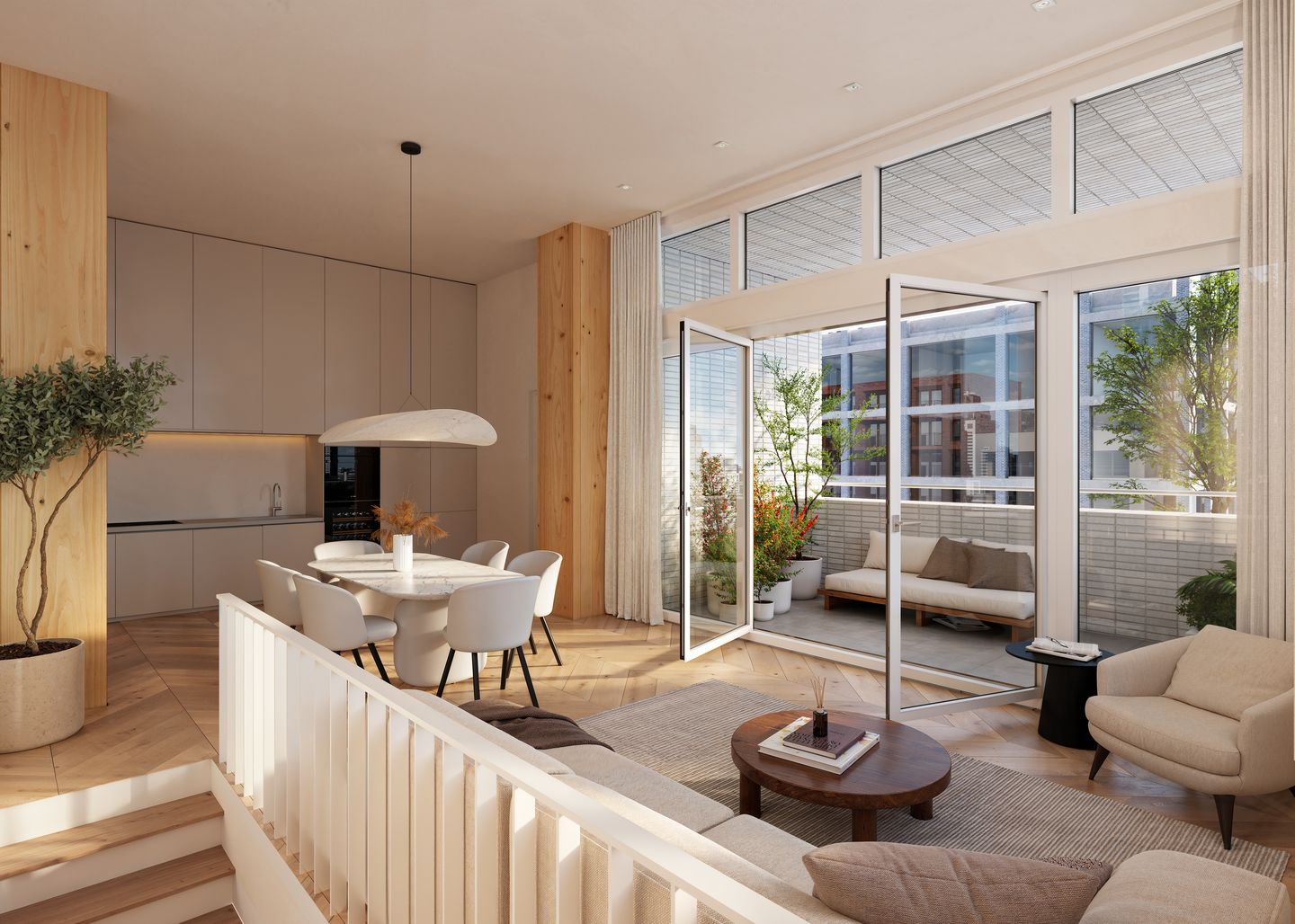 Op de 1e verdieping zorgt de grote glazen pui met openslaande deuren naar de loggia voor veel lichtinval naar de woonkamer. De loggia is circa 11 m2 (type A) / 12,5 m2 (type B) groot en ligt op het zuidoosten, het is hier al snel lekker vertoeven.