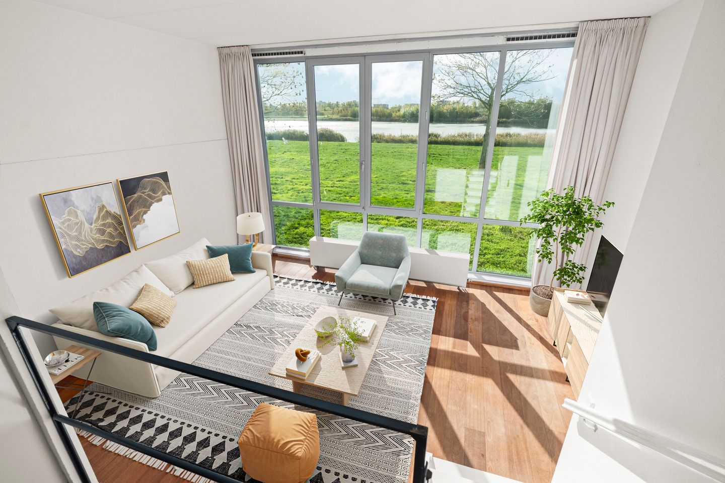 - Woonkamerramen van vloer tot plafond (3.8 meter);