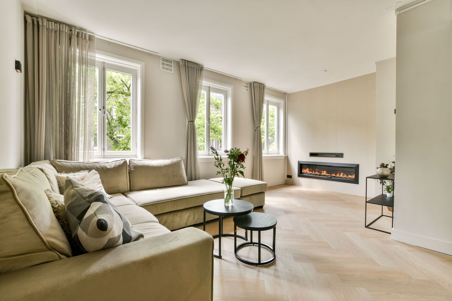 De ruime woonkamer biedt meer dan genoeg ruimte voor een heerlijke hoekbank om s'avonds een filmpje te kijken. De vloer is in een prachtige visgraat gelegd. In de woonkamer zit daarnaast een airconditioning-unit voor het verwarmen en koelen. De ingebouwde openhaard geeft de woonkamer een gezellige sfeer.