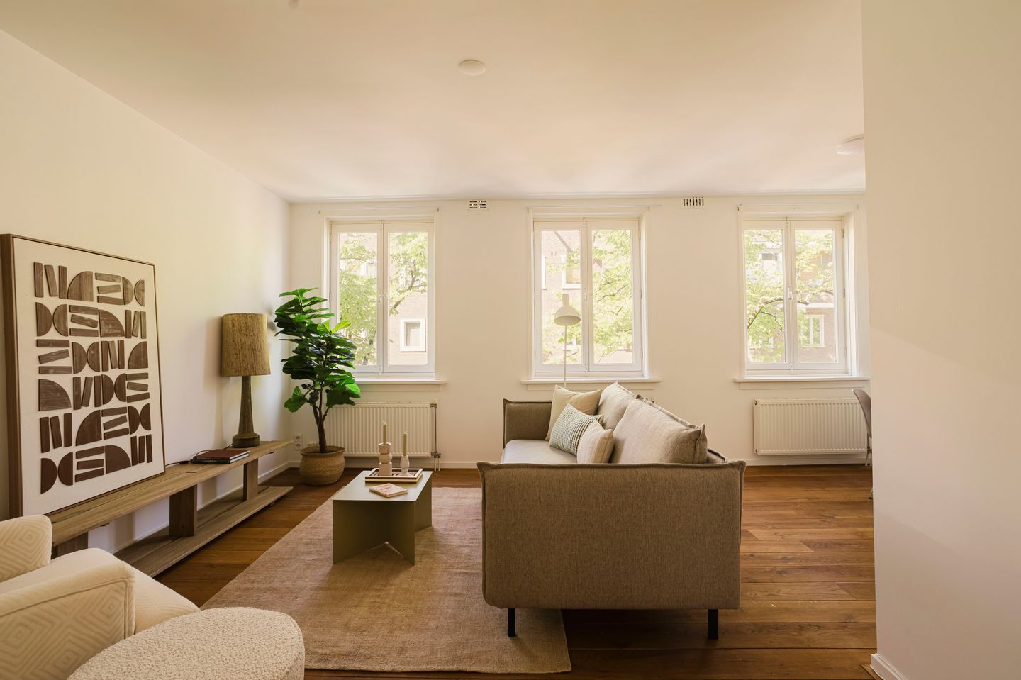Aan de voorzijde bevindt zich de ruime, lichte woonkamer met drie grote raampartijen. Hier is voldoende plek voor een comfortabele zithoek en een werkplek. Deze ruimte beschikt tevens over een inbouwkast met sfeervolle louvredeuren.
