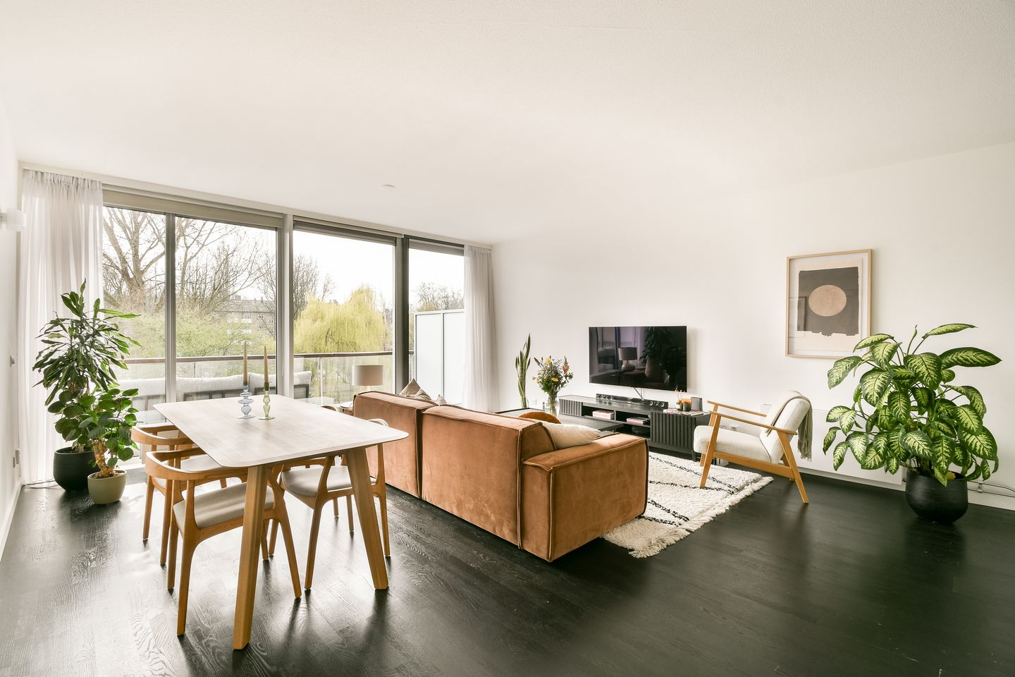 De lichte en ruime woonkamer vormt het hart van de woning en biedt dankzij de grote glazen schuifpui direct toegang tot het balkon van 11m², gelegen op het zuiden. Door de gunstige ligging geniet je hier van veel daglicht en een prettig uitzicht over het water en het groen.