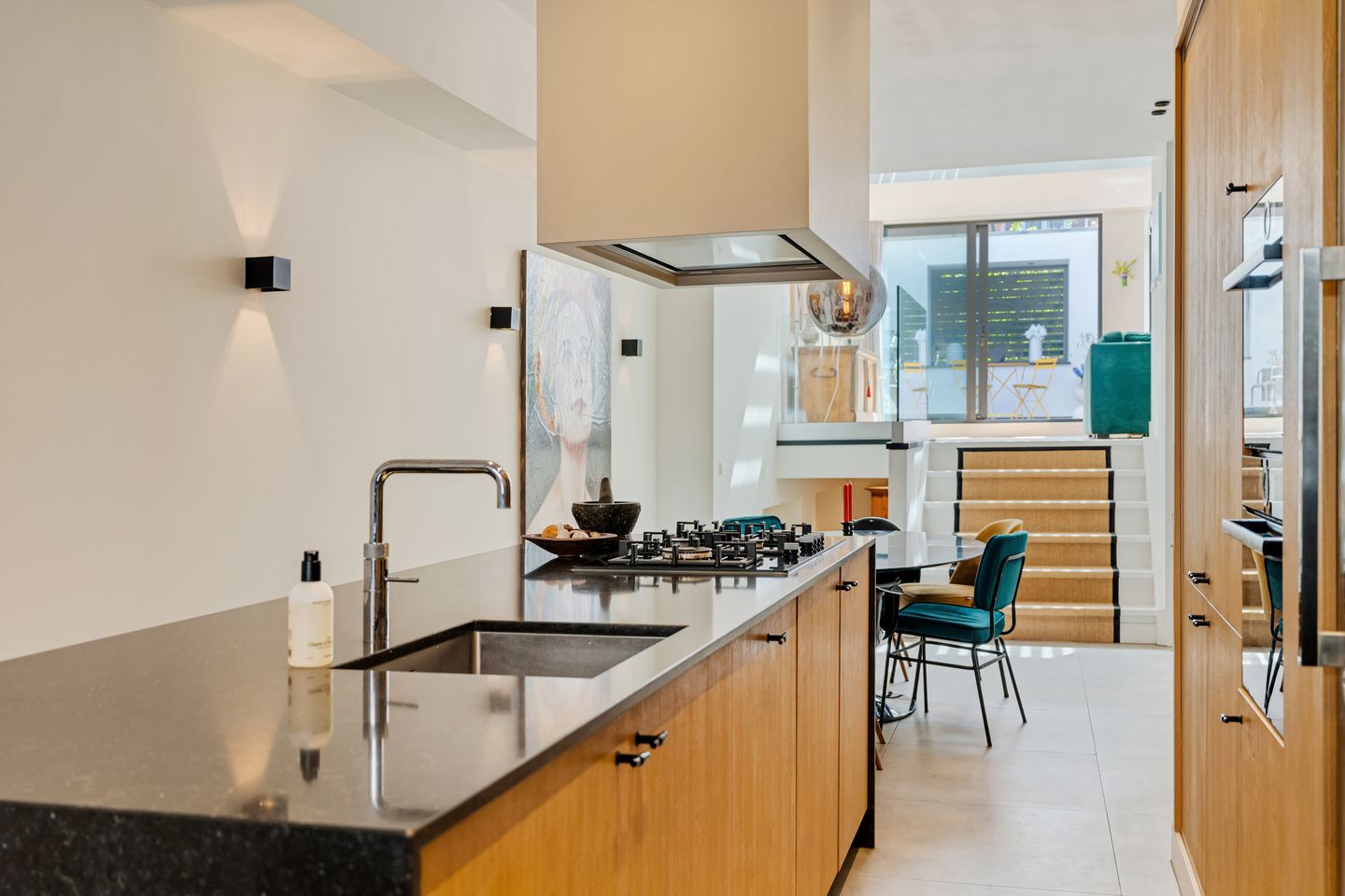 Via de entree, gescheiden door een glazen wand en deur, betreedt u een doordacht ingedeelde leefruimte. Aan de voorzijde bevindt zich de ruime open keuken met centraal kookeiland, voorzien van een gaskookplaat, spoelbak en hoogwaardige inbouwapparatuur waaronder een wijnklimaatkast, oven, magnetron, koel vriescombinatie en Quooker. Vanuit hier loopt de ruimte op natuurlijke wijze over in het eetgedeelte, waarbij koken en dineren naadloos samenkomen.