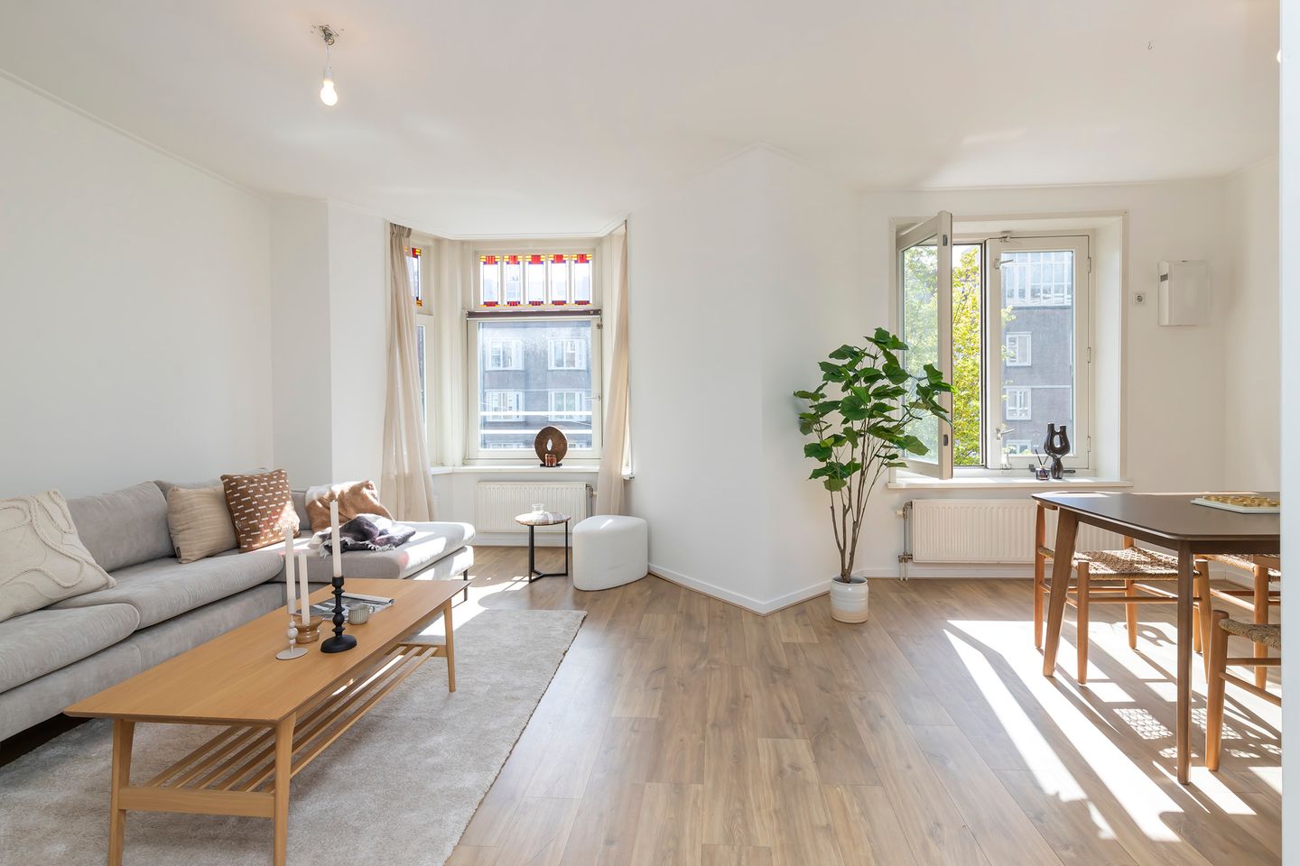 Dit sfeervolle 3-kamerappartement van 75 m² op de tweede verdieping combineert licht en ruimte. De aan de voorzijde gelegen woonkamer valt op door vier grote ramen met wijds uitzicht over de Overtoom en de Hollandse Manege. Het fraaie glas-in-lood zorgt voor een warme sfeer. Op het achtergelegen balkon kun je in stilte genieten van de avondzon.