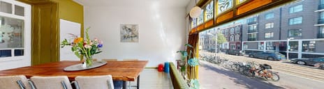Excellent location within short walking distance of the Vondelpark and with various nice shops, restaurants and cafes in the immediate vicinity. You can reach Leidseplein, the Foodhallen or the Concertgebouw located in the Museum Quarter within five minutes by bike or 15 minutes on foot. Easily accessible by public transport or by car.