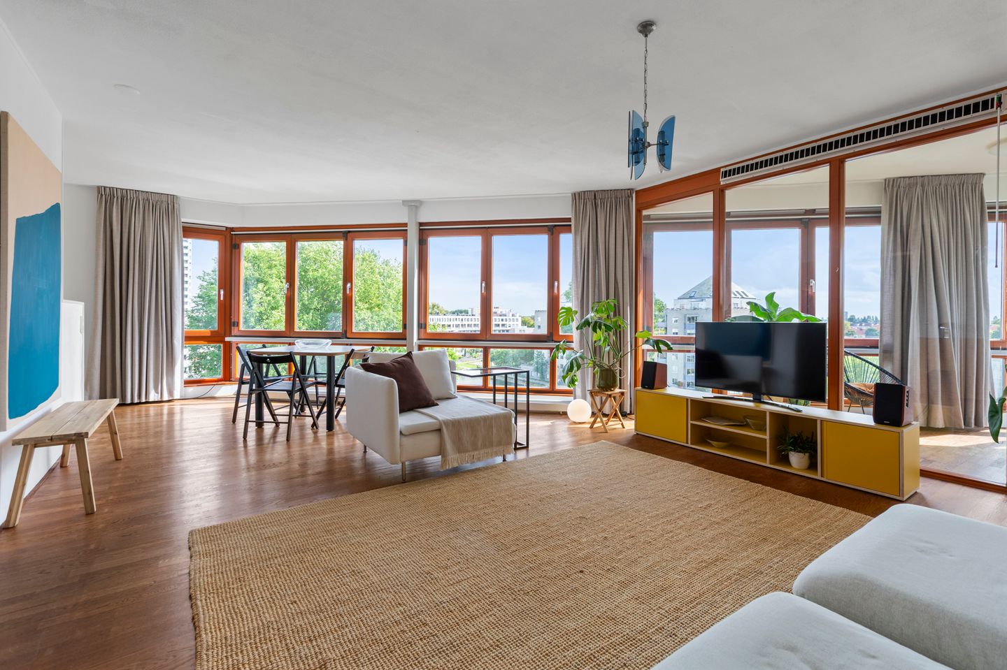 The entrance to the apartment is on the 5th and top floor, accessible by elevator, offering an exclusive sense of privacy. A spacious hallway welcomes you with a meter cupboard and a separate toilet with washbasin. The first bedroom of approx. 11 m² easily accommodates a double bed and wardrobe, while the modern bathroom is fitted with a wide sink unit and walk-in shower. The living room is exceptional, with floor-to-ceiling windows that open up to panoramic views over water and greenery. This apartment stands out for its impressive architectural layout, offering a truly distinctive living experience in the city. The semi-open L-shaped kitchen is fully equipped with an induction hob, built-in extractor hood, dishwasher, fridge-freezer, and a generously sized oven. Adjacent to the living room lies a versatile room, currently used as an office but equally well-suited as a second bedroom.