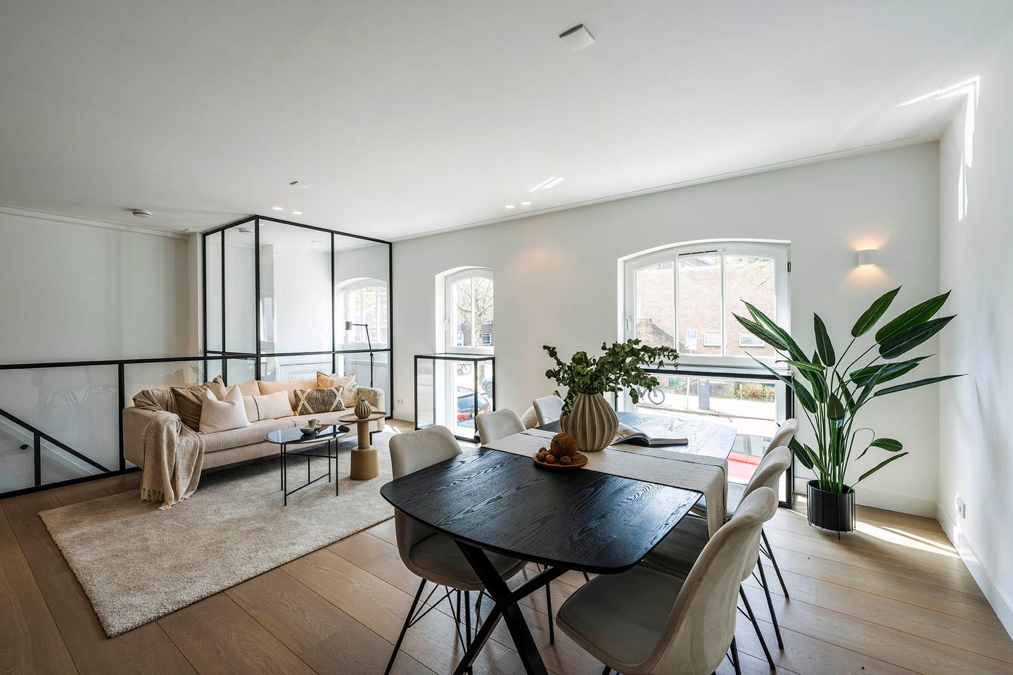 De woning heeft een eigen entree, die leidt naar een stijlvolle hal met zwarte stalen deuren. Een korte trap naar boven brengt je naar de lichte en ruime woonkamer. Deze ruimte biedt voldoende plek voor een gezellige zithoek en een royale eettafel. De halfopen keuken is een echte blikvanger: luxe uitgevoerd en voorzien van moderne inbouwapparatuur, waaronder een koel-vriescombinatie, combi-oven, vaatwasser en inductiekookplaat. Het marmeren aanrechtblad voegt een vleugje elegantie toe aan het geheel.