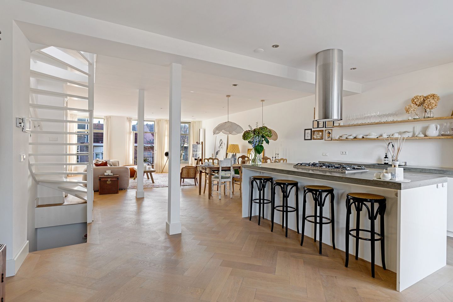 Via het nette trappenhuis bereik je op de tweede verdieping de eigen entree van het appartement. Een vaste trap brengt je naar de derde verdieping waar de leefruimte zich bevindt. Hier vormt de royale woonkamer aan de voorzijde het hart van het huis. Dankzij de ligging in een lichte straatbocht en de brede ramen valt het daglicht prachtig naar binnen. Je kijkt niet direct bij buren naar binnen, wat de ruimte een gevoel van openheid en rust geeft. De woonkamer is sfeervol afgewerkt met een visgraatvloer, ingebouwde spotverlichting en speakers in het plafond, details die direct laten zien dat dit appartement met zorg en stijl is gerenoveerd.