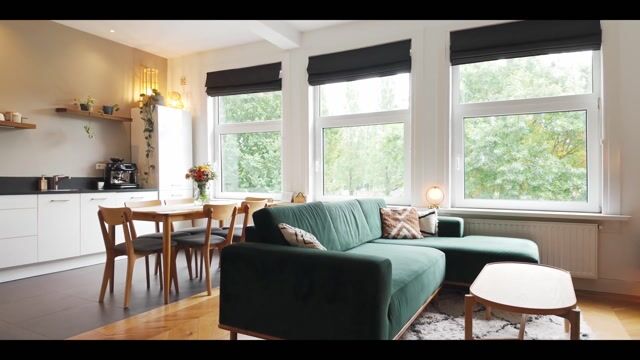 Through the recently renovated communal staircase, you can access the main corridor, which will give you practical space for coats and shoes. A full-wood thick oak floor in Hungarian point ties the home together across all rooms, giving it a uniquely elegant character. It be sanded for used for generations. The layout, recently redesigned, has a logical and space-efficient structure. Step into the south-facing living room and kitchen: a wide frontage opens to panoramic canal views -bright in every season and genuinely rare for Oud-Zuid. The living room offers plenty of space for sofa, armchairs and TV, cantered around a beautiful and perfectly functional wood fireplace that will cozy up your winter evenings. The kitchen offers a large 90-cm wide oven and a 5-burner stainless steel cooktop, as well as generous storage all around.