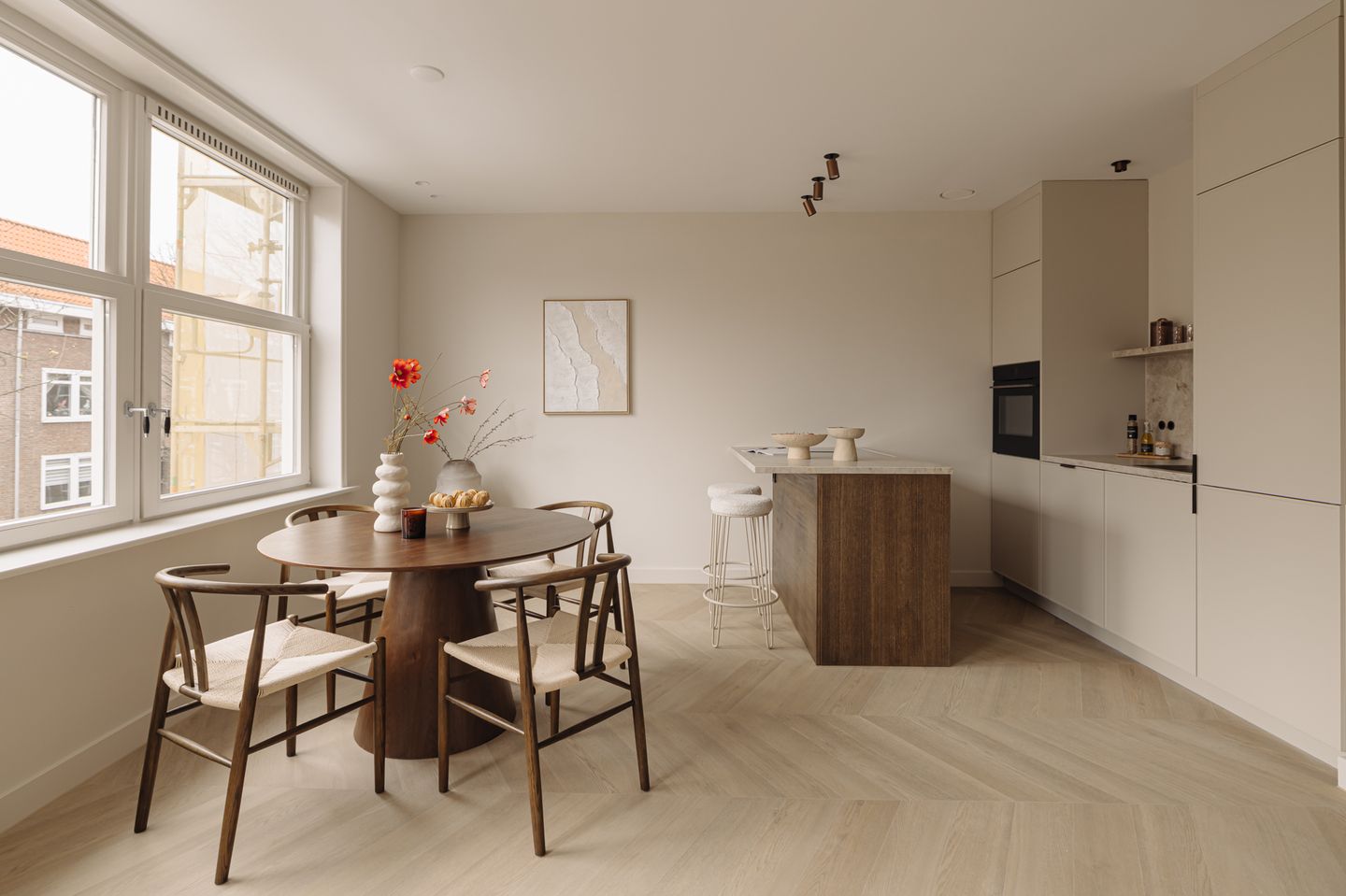 Binnen de woning is gekozen voor een consistente en luxe afwerking, waarbij de styling tot in detail is doorgevoerd en alle elementen samen een sterk geheel vormen. Zo komt het Taj Mahal blad terug in meerdere vertrekken, evenals het donkerbruine eikenhout van het keukeneiland, dat doorloopt in badkamermeubels en de nis in de slaapkamer. Deze aandacht voor detail komt ook terug in de keuze voor verzonken bronzen stopcontacten. Het geheel wordt versterkt door een doordacht lichtplan met donkerbronzen opbouwspots en bijpassende accenten zoals de verzonken stopcontacten, die in de hele woning zijn toegepast