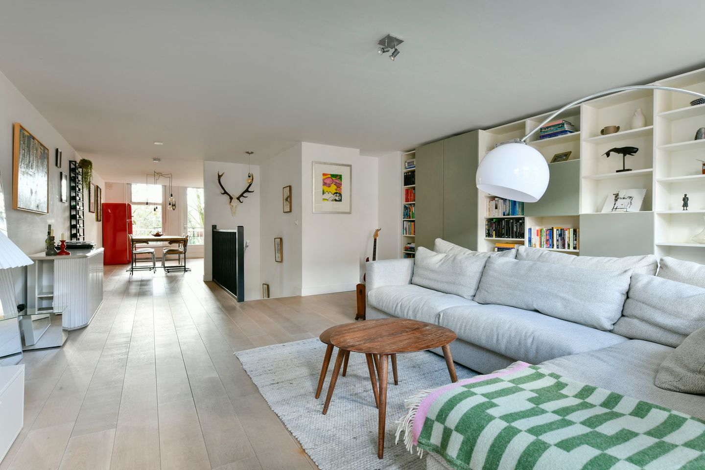 Entrance on the third floor. This living area with beautiful wooden floor has a spacious, open and light character. At the front is a large seating area with lots of light, thanks to the large windows that offer a beautiful view of the street. At the rear, a cozy dining area can be created next to the open kitchen.