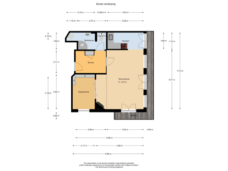 De woning heeft na de hardstenen buitentrap een eigen entree. Toegang tot de woning met ruime hal. Lichte woonkamer met toegang tot de half open keuken. Diverse openslaande deuren naar het balkon dat over twee zijdes gelegen is. Slaapkamer is tevens vanuit de woonkamer woonkamer toegankelijk. Vanuit de hal is er toegang tot een moderne badkamer die voorzien is van een douche, wastafel en toilet alsmede de aansluiting voor de wasmachine.