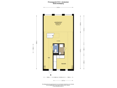 Via de gemeenschappelijke entree kunt u met de trap of lift naar de woning. Op de derde verdieping bevindt zich de toegang tot het appartement. De ruime open hal biedt plaats voor een garderobe en is uitgevoerd met een op maat gemaakte werkplek, voorzien van een Velux dakraam. Tevens is hier het separate toilet gesitueerd. De woonkamer is aan de voorzijde van het appartement gelegen en biedt met de drie brede raampartijen weids zicht over de Prinsengracht. De achterzijde beslaat de woonkeuken met plaats voor een eethoek. De keuken heeft een L-opstelling en is uitgevoerd met roomwitte kasten en lades in combinatie met een houten aanrechtblad. Voorts is de keuken grotendeels voorzien van inbouwapparatuur.