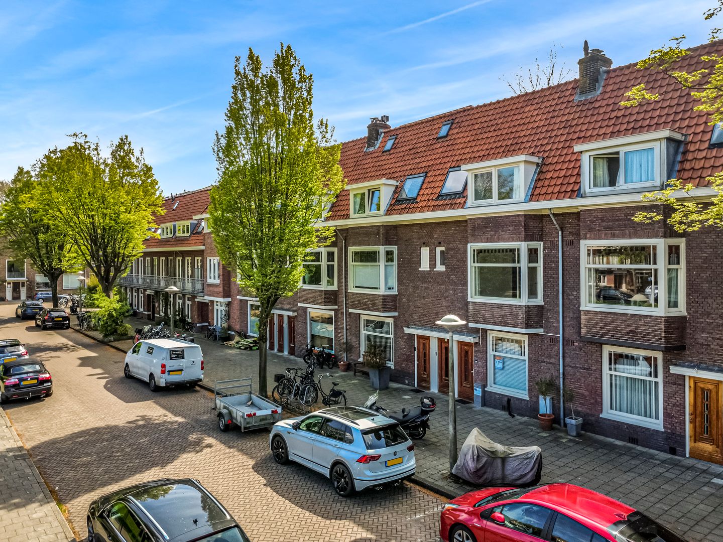 De open keuken (en het royale terras) ligt aan de achterzijde en heeft een prachtige lichtinval door de zuidelijke ligging. Aan de achterzijde uitzicht op de rustige en groene binnentuinen en de woonkamer heeft in de erker aan de voorzijde nog het authentieke glas-in-lood in de bovenlichten. Ten behoeve van de bovenwoning liggen er nog 6 zonnepanelen op het dak.