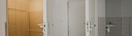 Via het gemeenschappelijke trappenhuis bereikt u de vierde verdieping, waar het appartement zich bevindt. Bij binnenkomst komt u in de hal, die toegang biedt tot diverse vertrekken. De badkamer is uitgerust met een wastafel en een douche, terwijl het toilet met fonteintje zich tegenover de badkamer in een aparte ruimte bevindt.