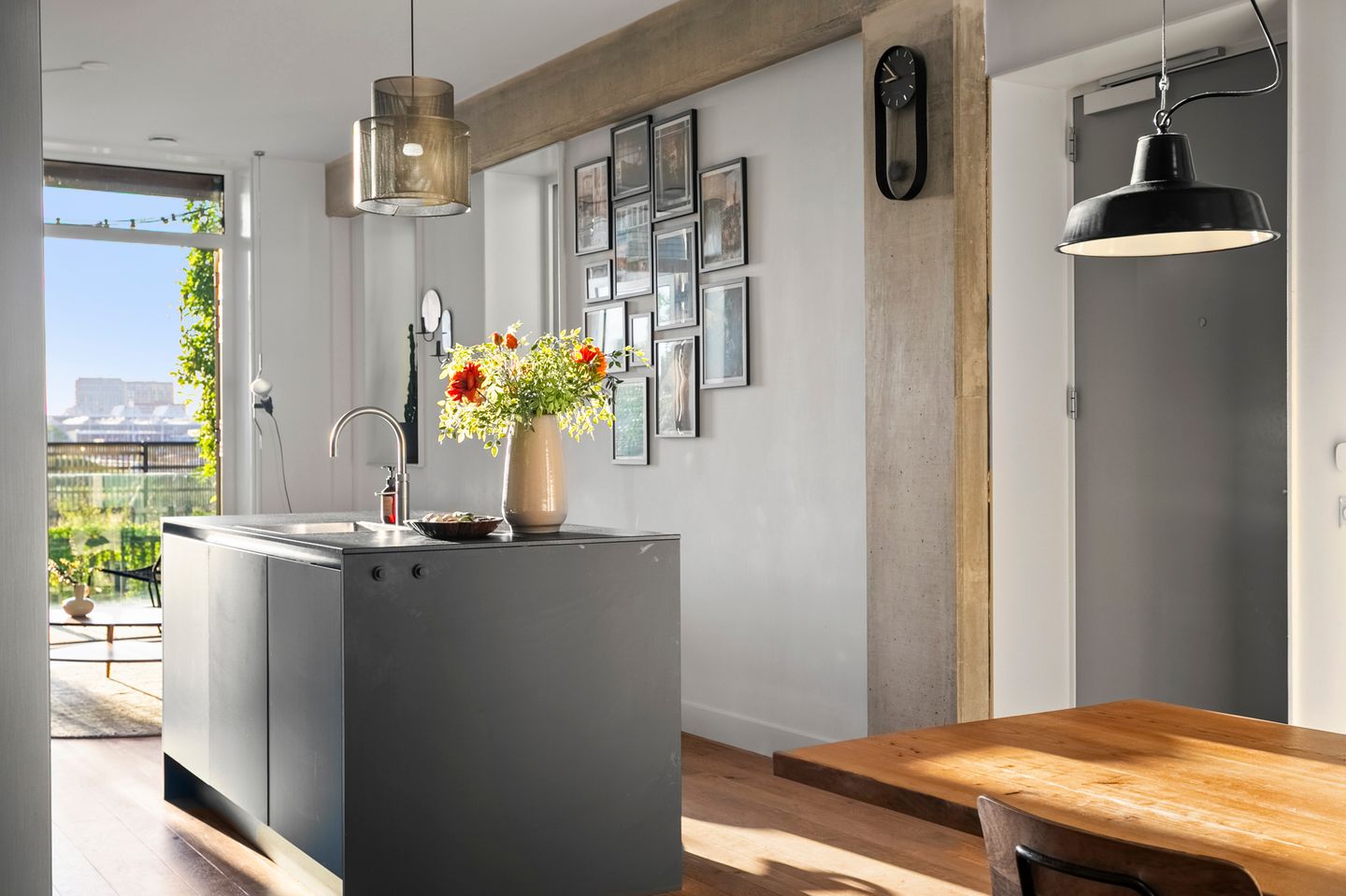 De woning (ca. 86 m²) heeft een eigen entree – alsof je je eigen loft binnenstapt. Bij binnenkomst stap je direct een open en stoere leefruimte binnen, waar betonnen balken, hoge plafonds en open keuken zorgen voor een rauwe en stijlvolle sfeer. De robuuste eikenhouten vloer verbindt de ruimtes en brengt warmte in het geheel. De ruime woonkamer met open keuken vormt het hart van het huis. Of je nu een snelle maaltijd bereidt of uitgebreid kookt met vrienden: met het kookeiland, de Quooker en de hoogwaardige inbouwapparatuur heb je alles bij de hand. Er is ook een extra kamer gecreëerd – met glas en hout – perfect als werkplek, atelier of logeerkamer. Slim detail: onder deze kamer is veel bergruimte gecreëerd, netjes weggewerkt maar verrassend ruim. Verder beschikt de woning over een comfortabele slaapkamer, badkamer met karakter, apart toilet, ruime inloopkast en extra bergruimte in de gang. Het balkon grenst aan de woonkamer, waar je met de openslaande deuren volop geniet van de middag- en avondzon. Het gemeenschappelijke dek is heel makkelijk te bereiken en biedt een extra buitenruimte met picknicktafels waar je kunt borrelen met buren, vrienden en familie.