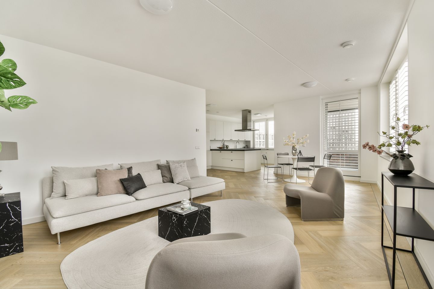 The modern, luxurious open-plan kitchen with a semi-island completes the picture and is a dream for any cooking enthusiast. It offers ample work and storage space, as well as all the necessary high-quality built-in appliances, including a Quooker (hot, cold, and sparkling), an induction cooktop with extractor hood, an American-style refrigerator, two cooling drawers, a dual-function English dishwasher, a built-in combination microwave, and an oven.