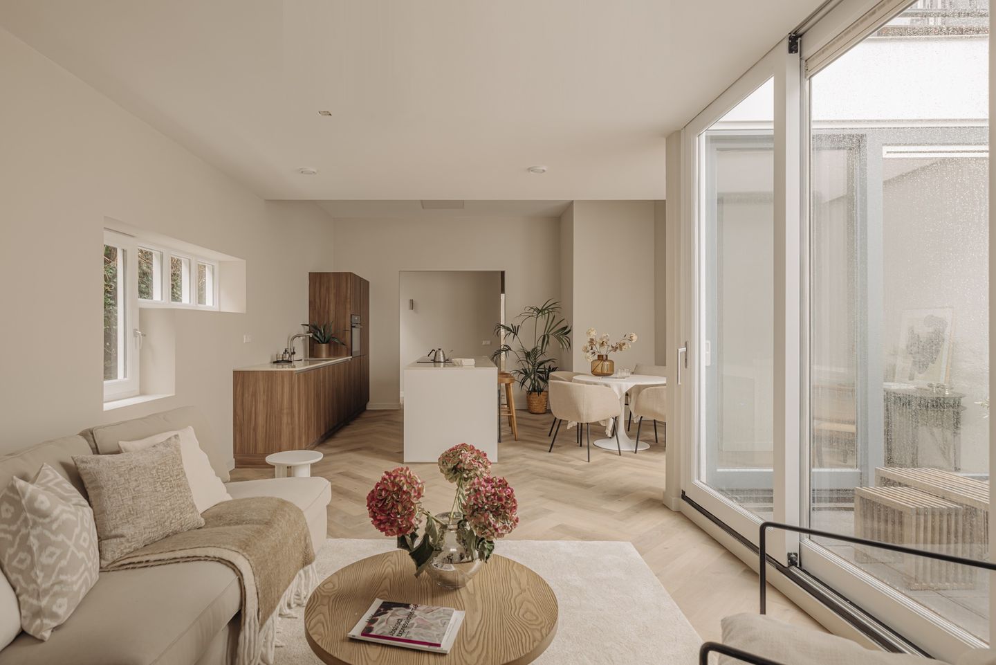 Access the private entrance through the lushly planted alley. The spacious hallway immediately impresses with its high ceiling and a direct view of the living area. The height of the ceilings and the depth of the property stand out, as does the playful layout of the living room and dining kitchen, separated by a patio of approximately 6m² with glass sliding doors.